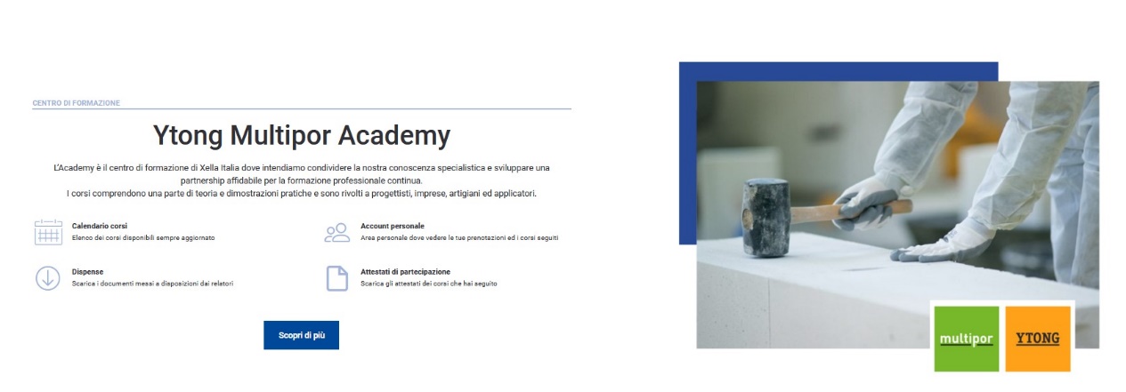 Nell’area Academy invece è presente il calendario dei corsi di formazione tecnica e applicativa, articolati per tematica del corso (Ytong, Multipor, Malte e Intonaci), e per target. Infatti l’Academy propone programmi diversificati per le diverse professionalità: progettisti, imprese e applicatori, rivendite. I corsi pratici possono essere organizzati a richiesta anche presso le rivendite e le scuole edili (Academy on Tour), così come è possibile organizzare presso l’Academy di Pontenure corsi ad hoc per associazioni o gruppi di imprese. Non ultimi anche gli interventi formativi presso scuole superiori CAT e università e l’organizzazione di visite guidate allo stabilimento produttivo.